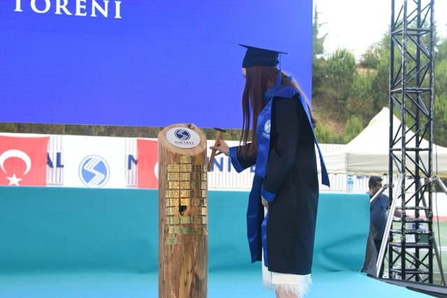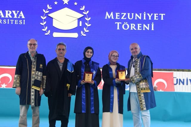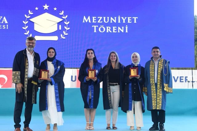 Törenin devamında fakülte birincisi Zeynep Aybek, ikincisi Nisanur Düzcan ve üçüncüsü Nurseza Ünal sahneye davet edildi. Nisanur Düzcan, mezuniyet kütüğüne ismini çakarak fakülte adına geleneksel bir sembolik anı yaşattı.